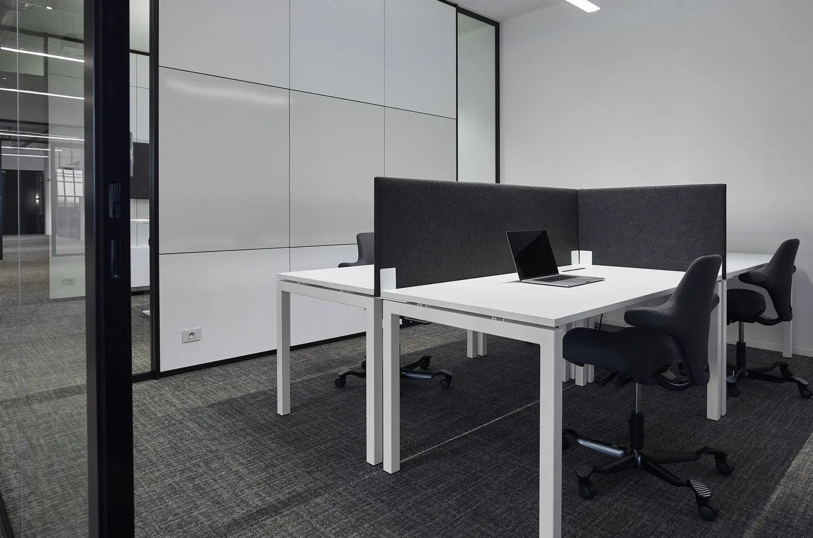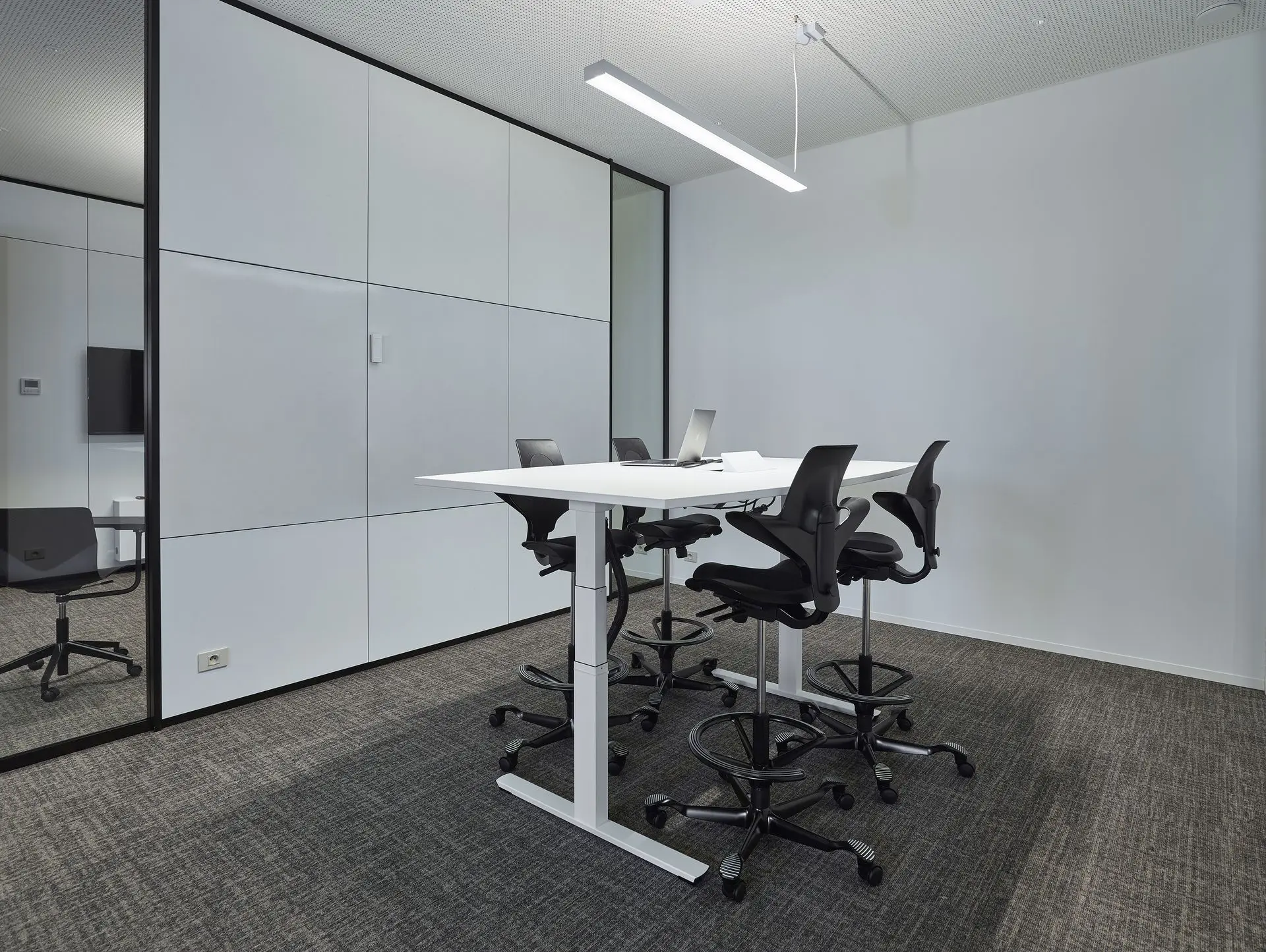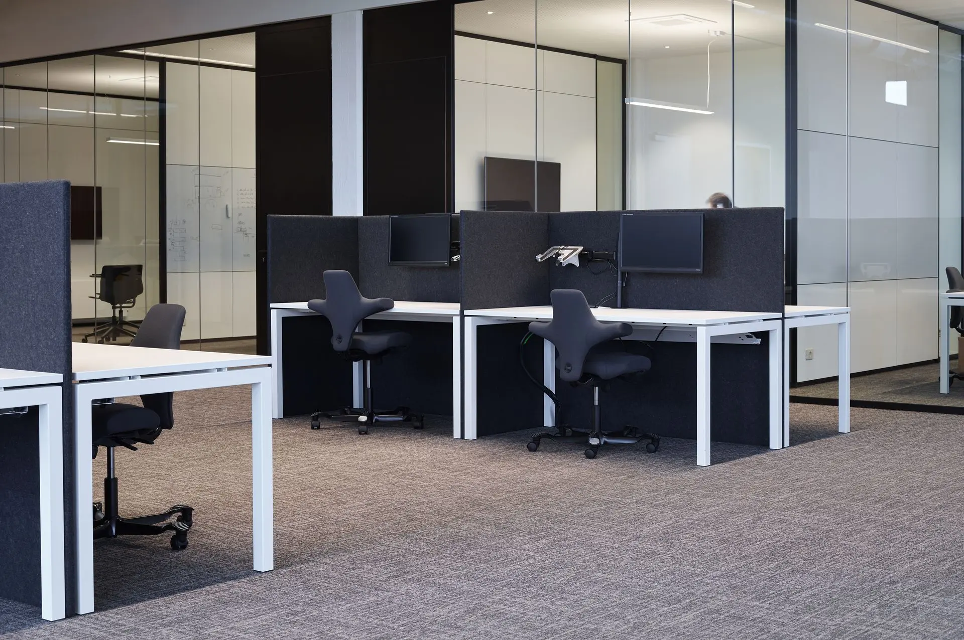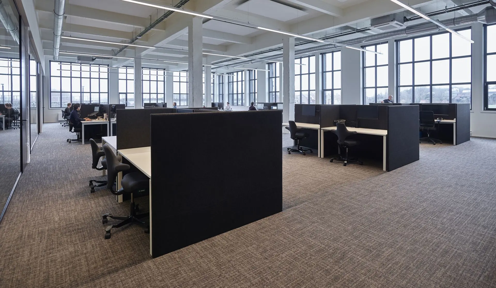 Open werkzones, vergaderruimtes en zithoeken lopen vloeiend in elkaar over, wat samenwerking en informele ontmoetingen stimuleert. Elk meubelstuk is zorgvuldig gekozen voor zijn ergonomie, duurzaamheid en esthetiek.