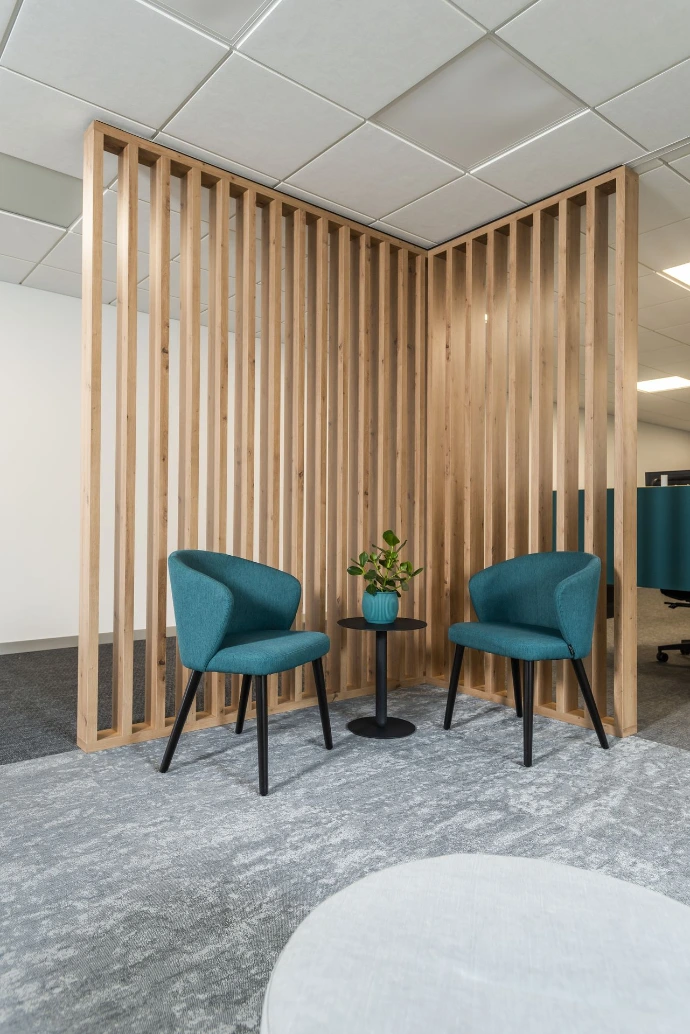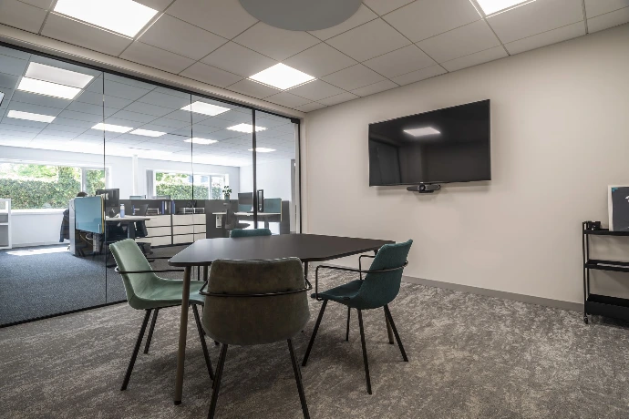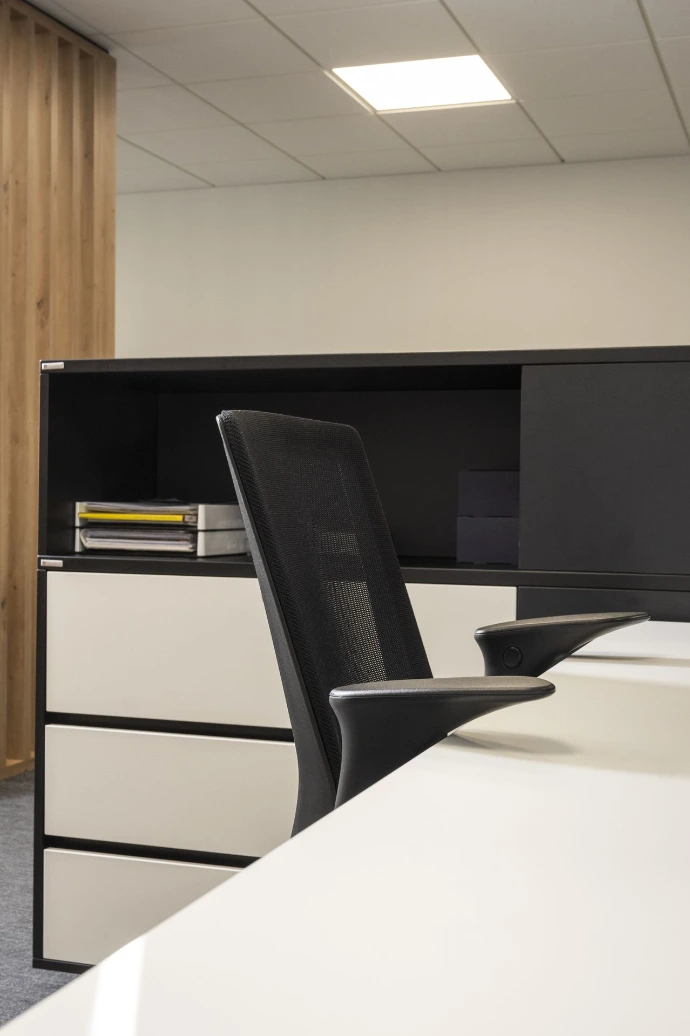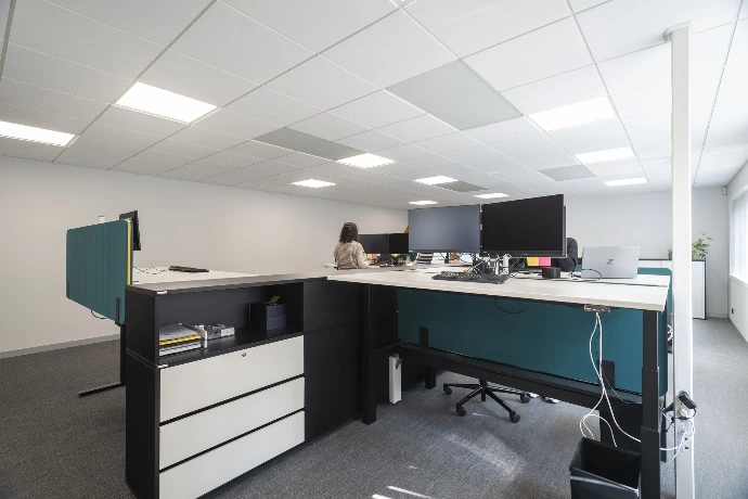 De werkplekken werden ergonomisch ingericht met aandacht voor comfort en flexibiliteit, terwijl vergader- en overlegzones zorgen voor een vlotte samenwerking. Neutrale kleuren worden gecombineerd met subtiele accentkleuren en akoestische oplossingen, wat bijdraagt aan rust en concentratie op de werkvloer.